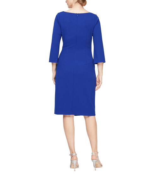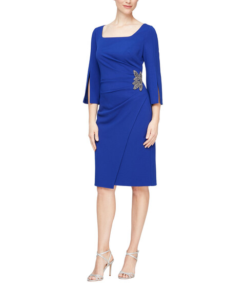 Attend the day and evening parties wearing the sleek Alex Eveningsâ„¢ Short Sheath Dress with Split Sleeves. It features a square neckline and beaded floral accent along the waistline.