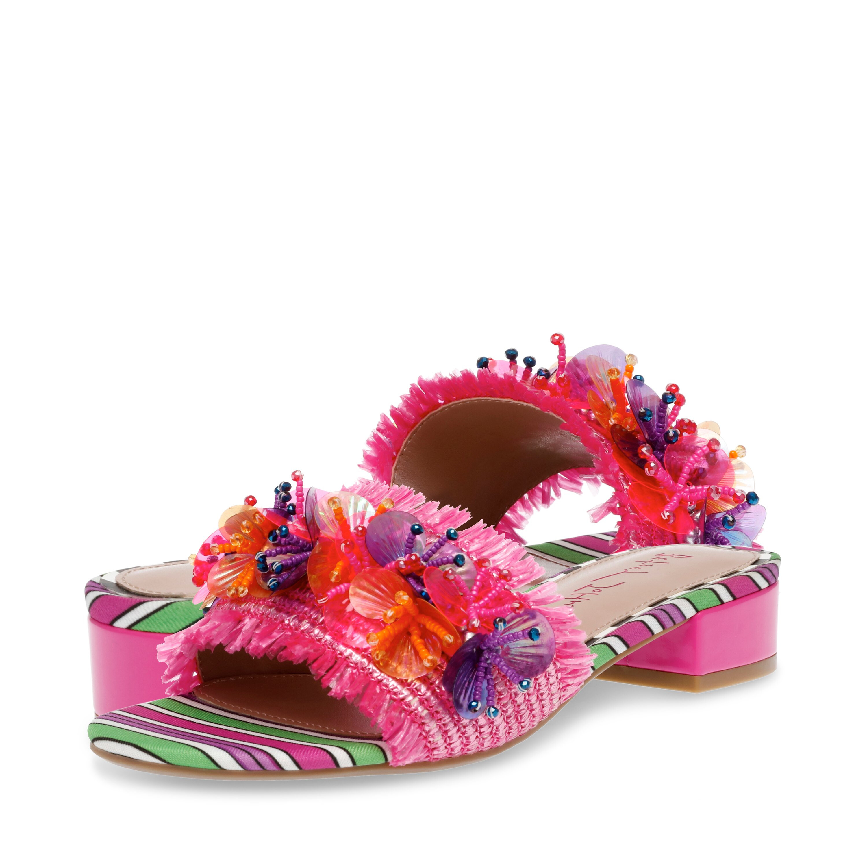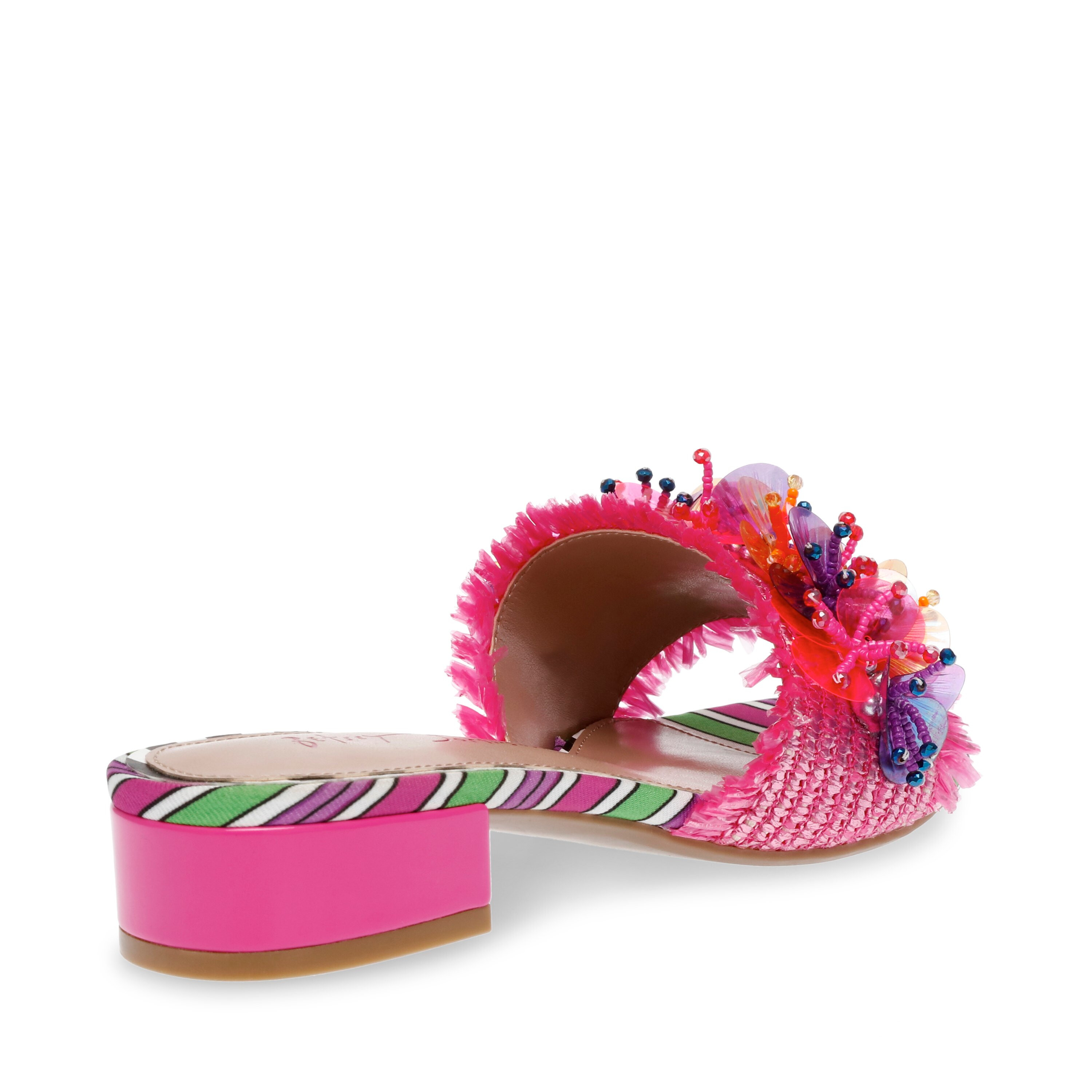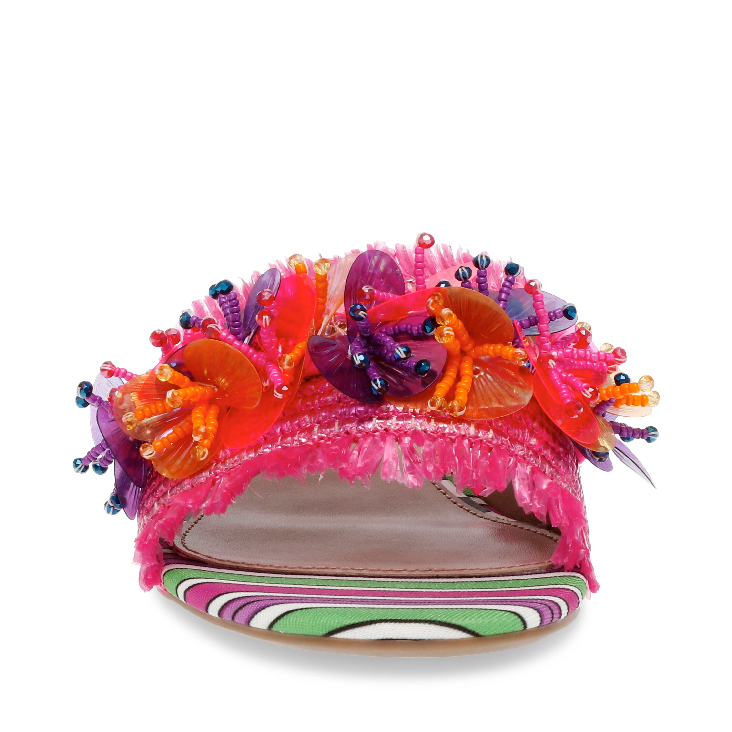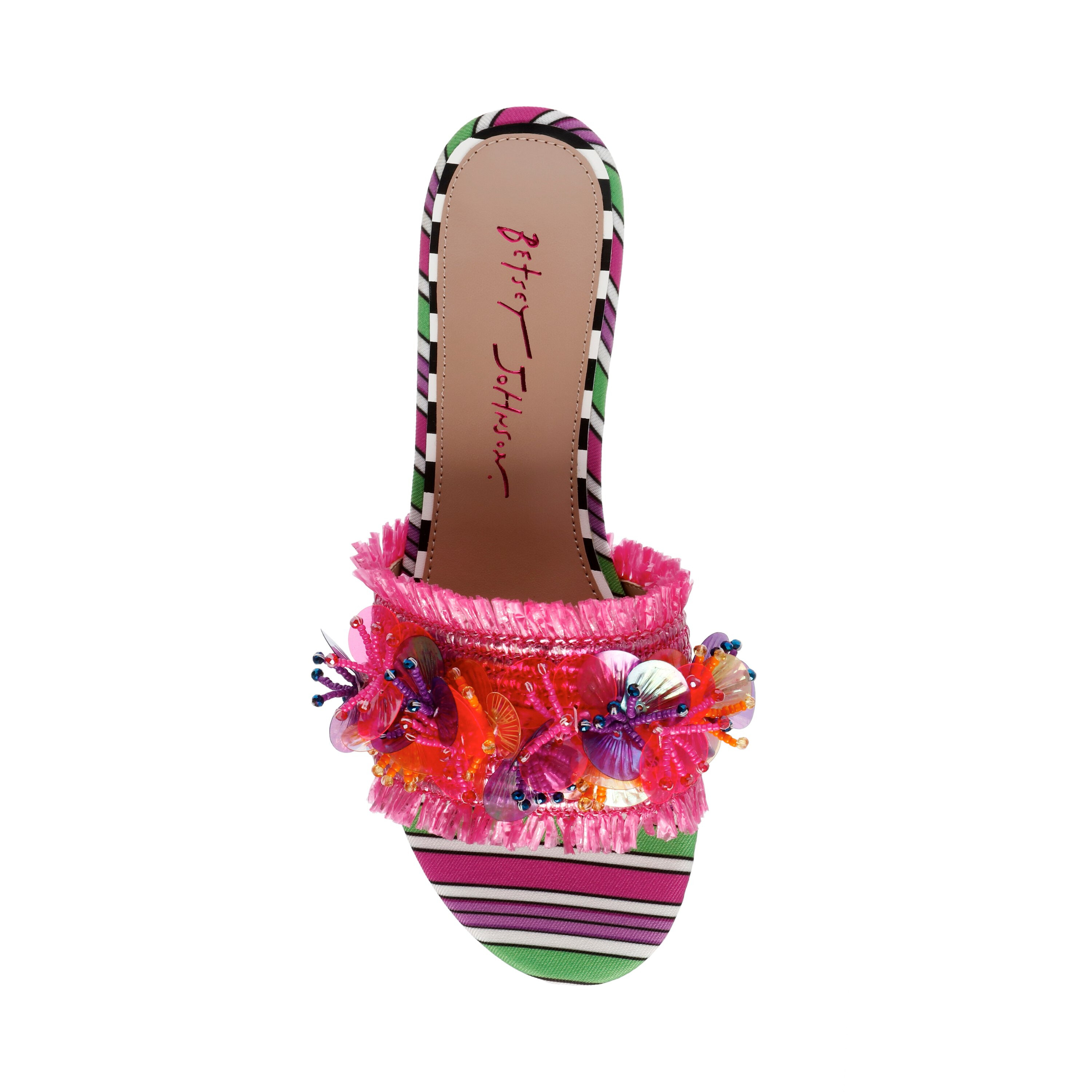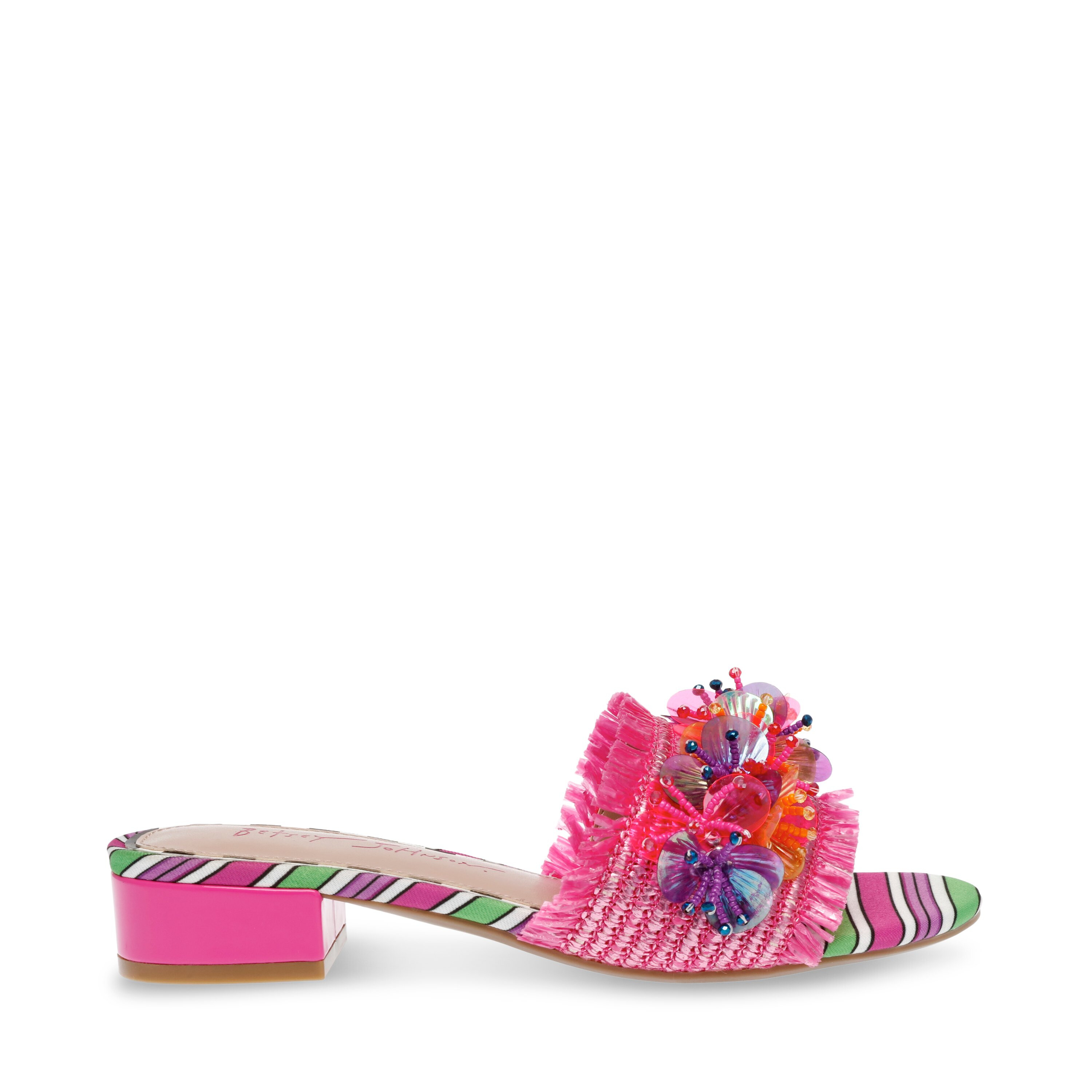 Transition every look of yours into an eye-catching retreat as you wear the colorful and vibrant Blueâ„¢ by Betsey Johnson Peyten Flat Sandals. The slip-on footwear features ornamented raffia upper top strap with synthetic rubber lining and cushioned synthetic insole.