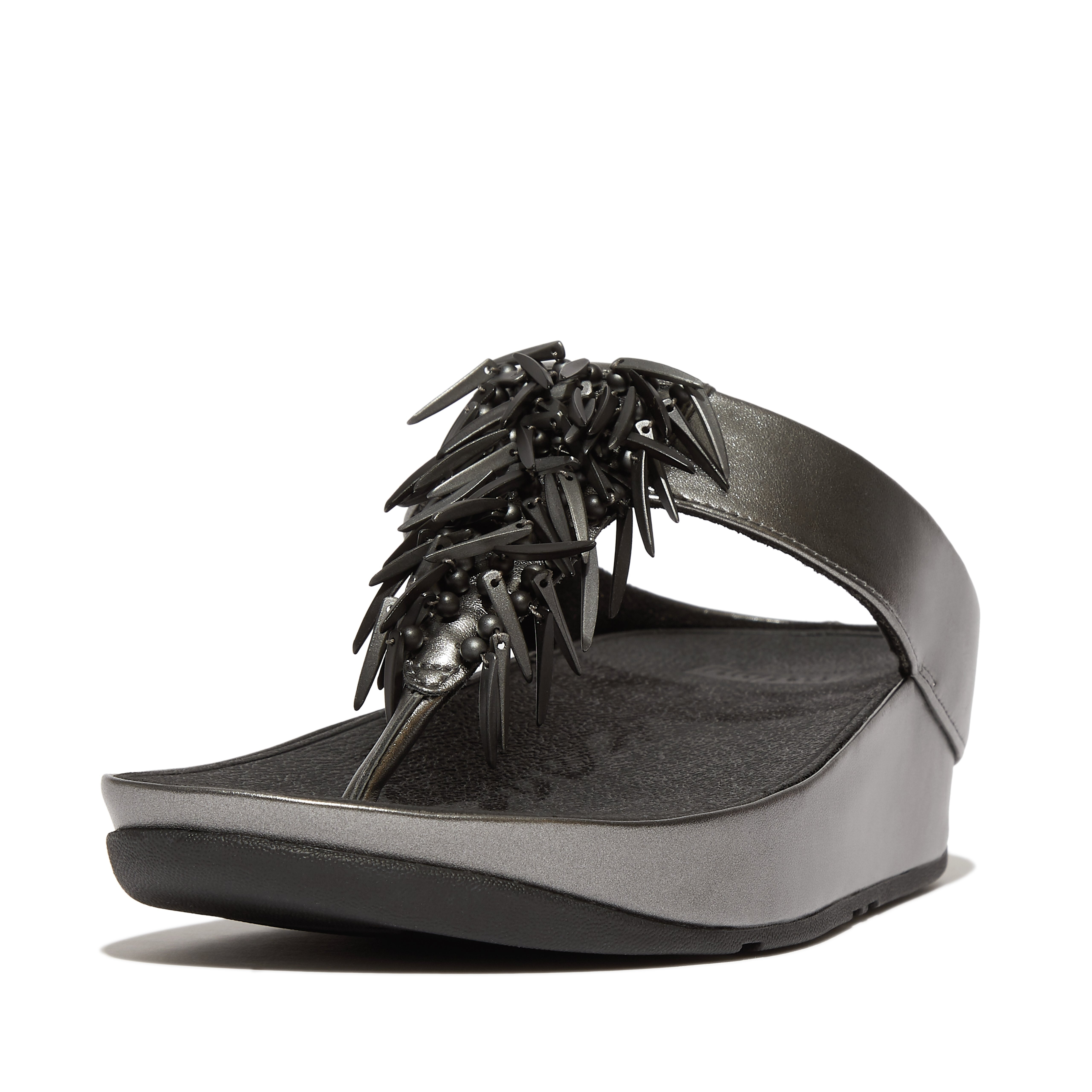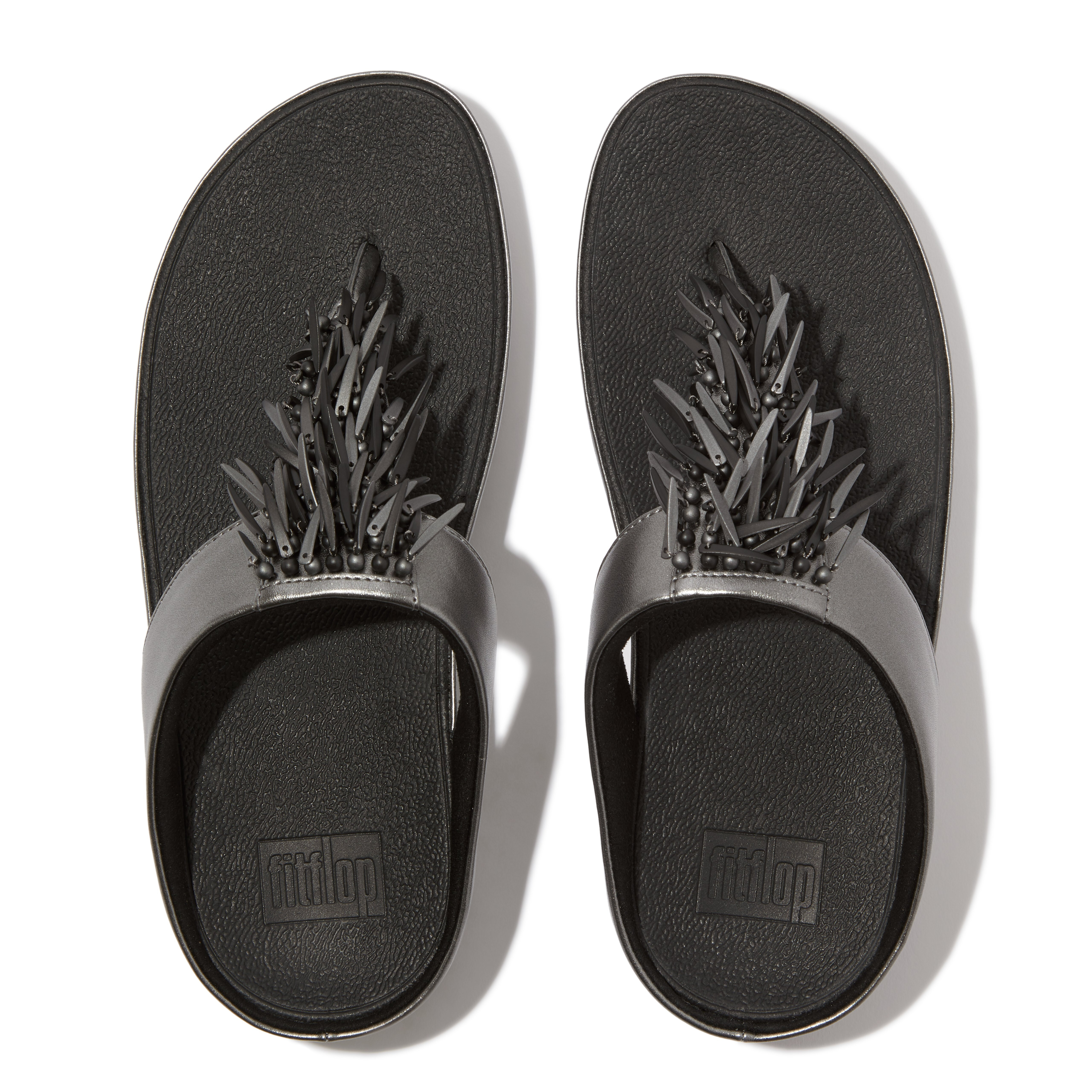 Add a glamorous touch to your outfits by wearing the FitFlopâ„¢ Rumba sandals. Featuring a toe-post design with shiny, swishy fringes formed of multi-tonal 'crystal' beads, these stylish sandals are perfect to match different styles and outfits. The cushioned Microwobbleboardâ„¢ midsole of these sandals offers all-day comfort. From matching your party outfits to styling up your casual looks, these toe-post sandals are the perfect choice.