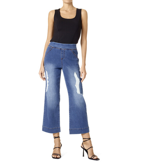 Amp-up your denim look without losing your style wearing the HUE® High-Rise Shredded Cropped Denim Flare jeans.