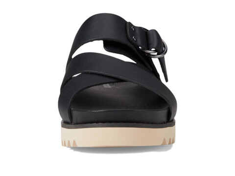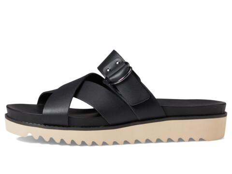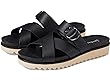 Crossed straps on top of foot with single buckled strap.