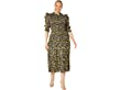Maxi-length dress featuring high ruffled neckline and elbow-length puff sleeves with smocked cuffs.