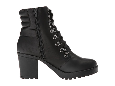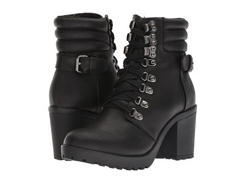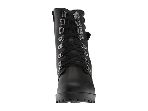 • Heeled combat boots feature a synthetic leather upper.