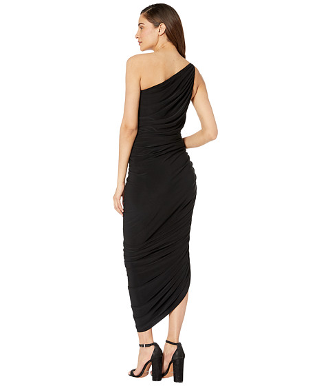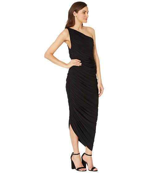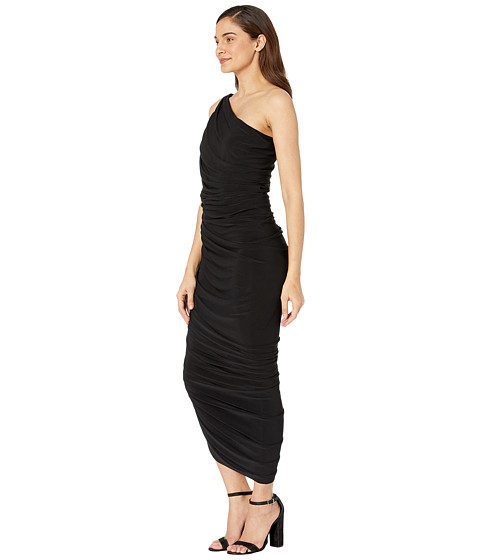 Single-shoulder gown flaunts ruching throughout the side seams for an allover gathered effect.