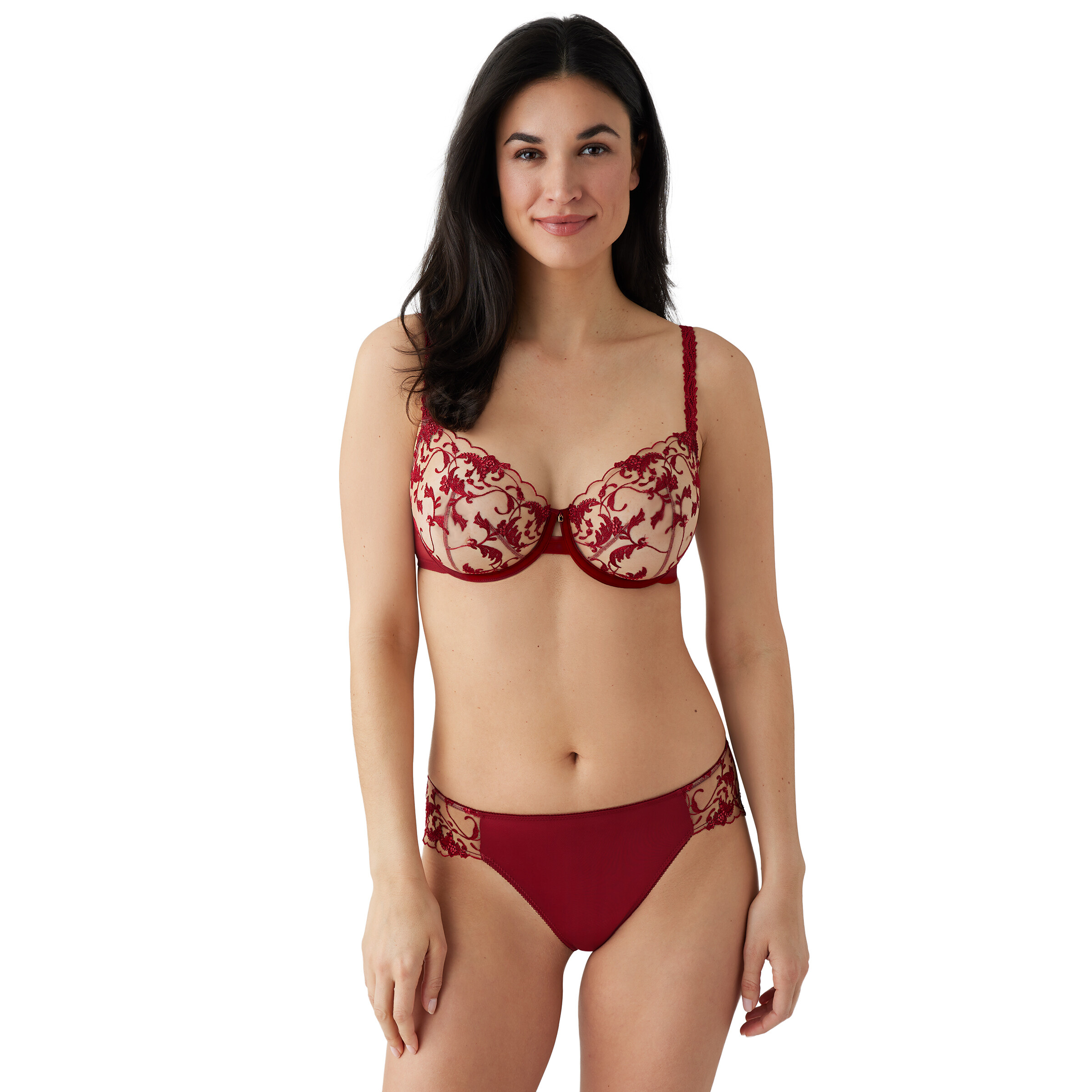 • Feel comfortable wearing the fashionable Wacoal® Dramatic Interlude Underwire 855379. This mid coverage bra features embroidered cut-and-sew mesh cups with metallic details, embroidered decorative front straps, mesh straight back, and adjustable back straps for a customized fit. It comes with adjustable hook-and-loop back closure.