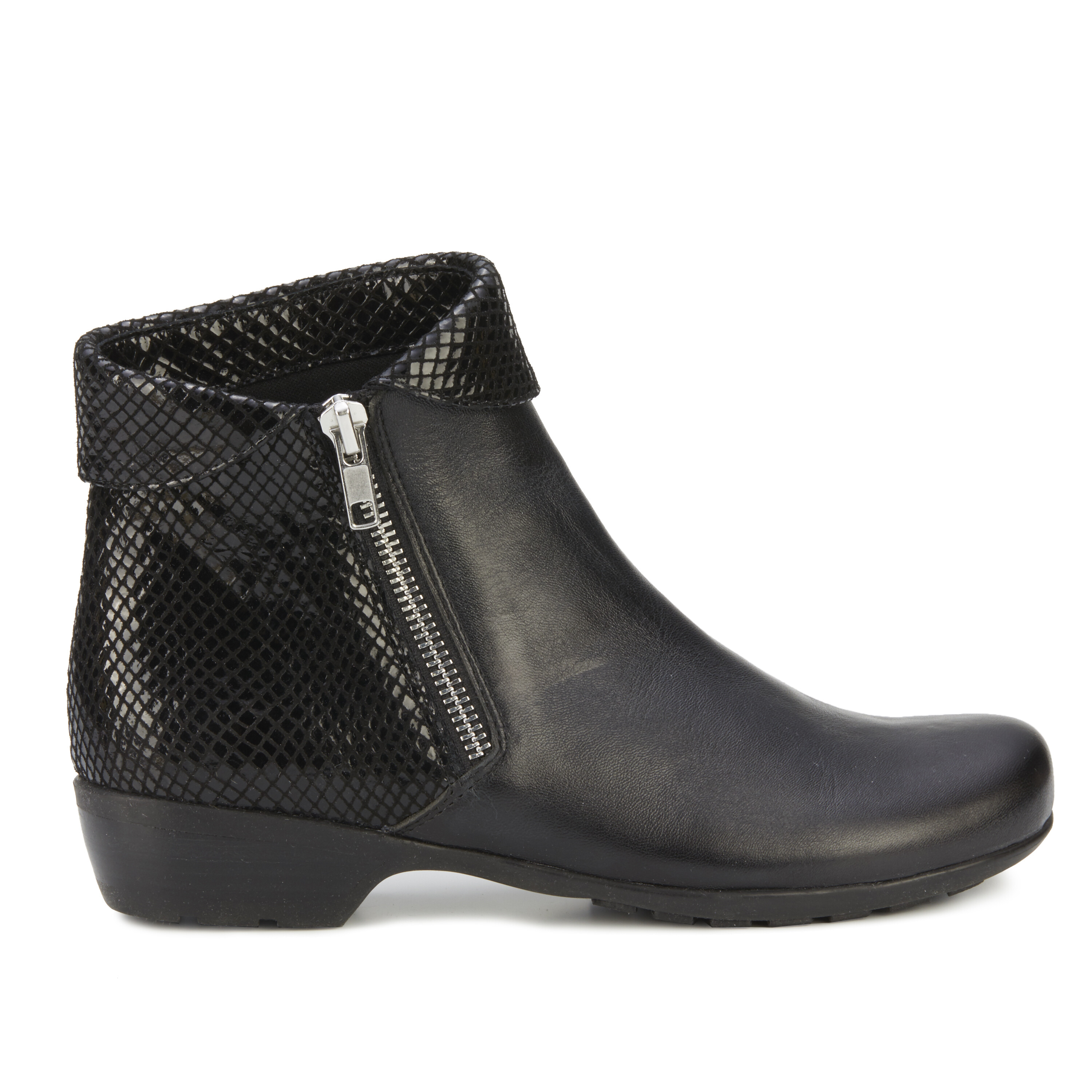 • Pantoful pentru gleznă Walking Cradles® Emmy vine într-o parte superioară din piele netedă și suplă, cu un guler și un sfert pliat cu șarpe șic.