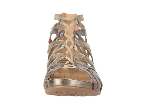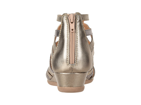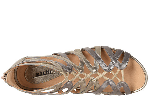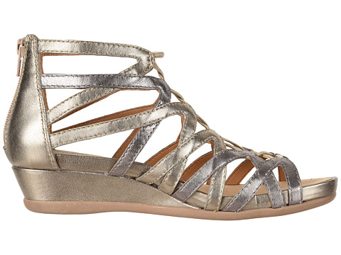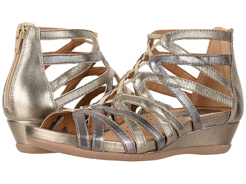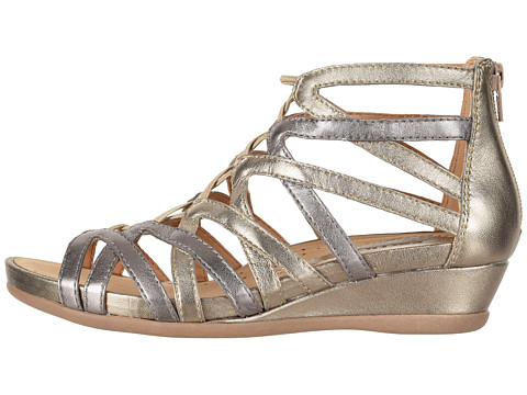 Burnished or metallic leather upper in a strappy silhouette.
