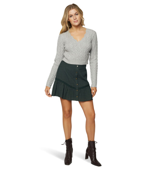 • Cropped cable-knit sweater features a distinguished surplice neckline with scalloped trim, accompanied by long sleeves and a straight hemline.